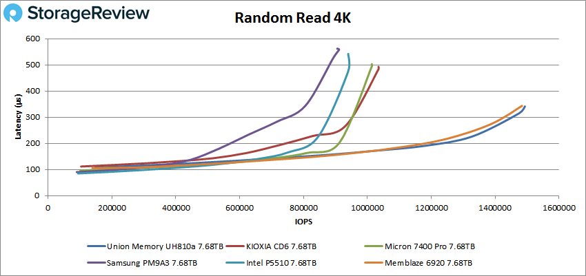 在第一個VdBench工作負載分析——4K隨機讀取速度上,憶聯UH810a在343.2μs的延遲下擁有令人印象深刻的1490K IOPS的峰值性能,在參與測試的6款ESSD中排名第一。