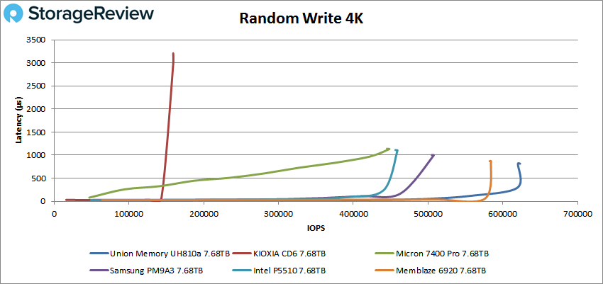 4K隨機寫入速度方面,UH810a仍然保持在頂部并取得明顯領先,峰值為620K IOPS,延遲為816.7μs。