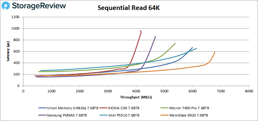 切換到64K連續工作負載后,UH810a以665μs的延遲實現6GB/s的讀取速度 (96K IOPS) 位居第三。