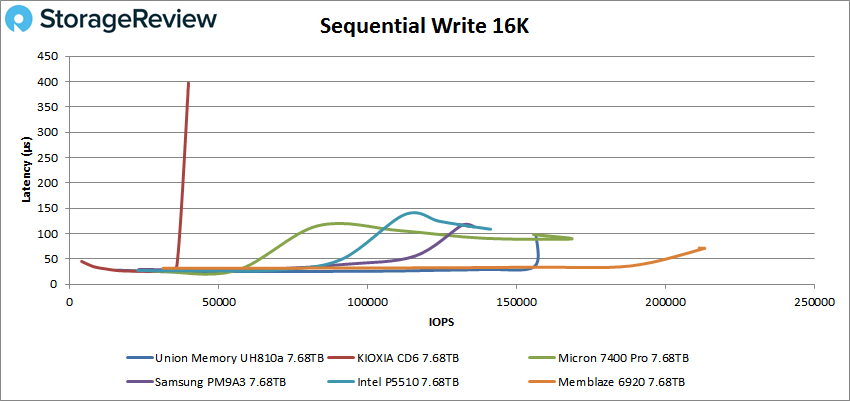 UH810a加快了16K寫入性能的步伐,峰值為157K IOPS (2.45GB/s),延遲為97.7μs(盡管最后出現峰值)。
