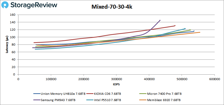 在混合配置文件(70%讀取、30%寫入,4K)中,UH810a以535K IOPS的峰值和114.9μs的延遲排名第二。