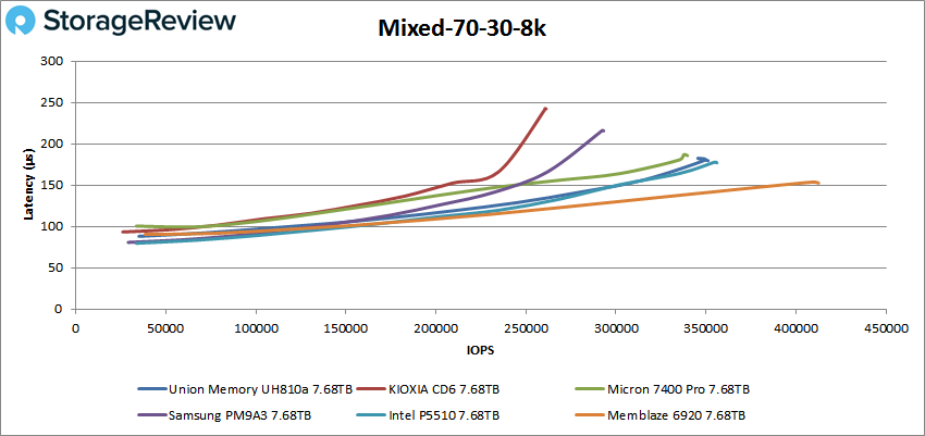 在混合配置文件(70/30 8K)中,UH810a以350K IOPS達到峰值,延遲為179.6μs,位居第三。