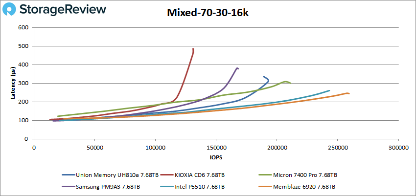 在混合配置文件(70/30 16K)中,UH810a在延遲為33.52μs時達到192,559 IOPS。