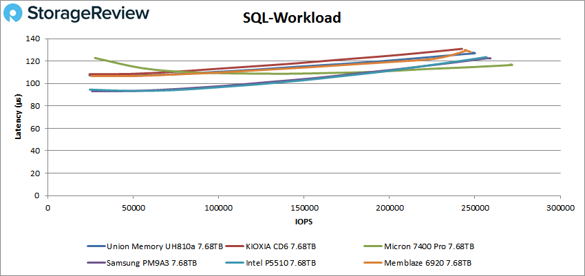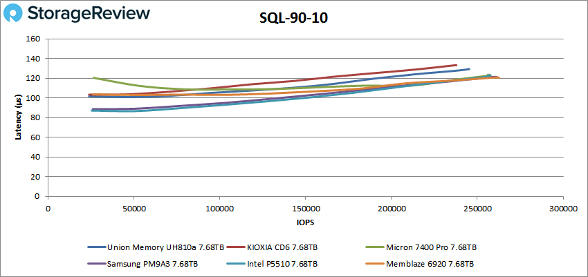 SQL 90-10的性能類似,UH810a在129.2μs的延遲下達到了245K IOPS的峰值。