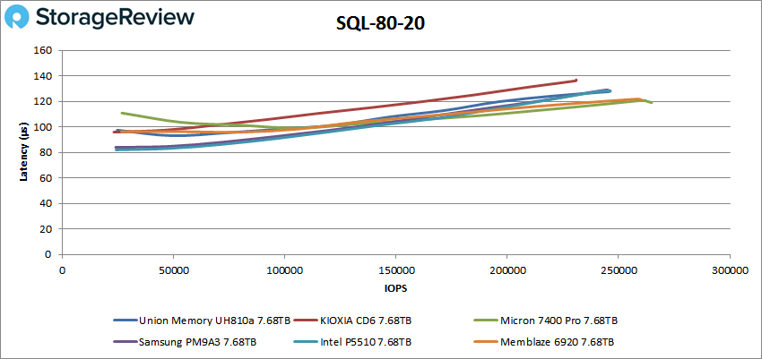 使用SQL 80-20,UH810a獲得了媲美三星PM9A3、英特爾P5510的性能,最終以127.6μs的延遲達到246K IOPS的峰值。