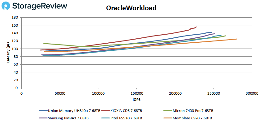 從Oracle開始,UH810a在141.3μs時的峰值性能為247K IOPS。