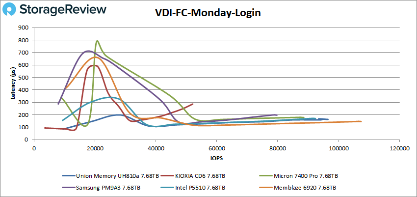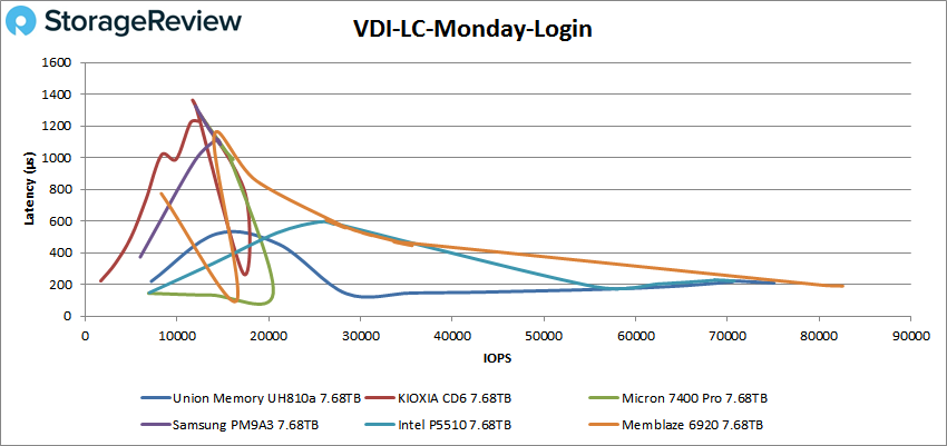 VDI LC周一登錄方面,UH810a繼續保持其令人印象深刻的穩定性能,峰值約為75K IOPS,延遲為209.2μs,足以再次位居第二。
