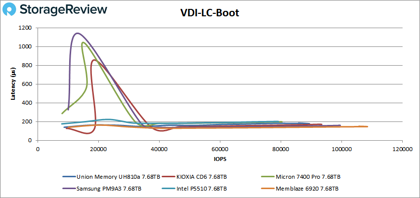 VDI鏈接克隆(LC)引導方面,UH810a以177.7μs的穩定延遲實現90K IOPS峰值性能,表現出穩定的性能。