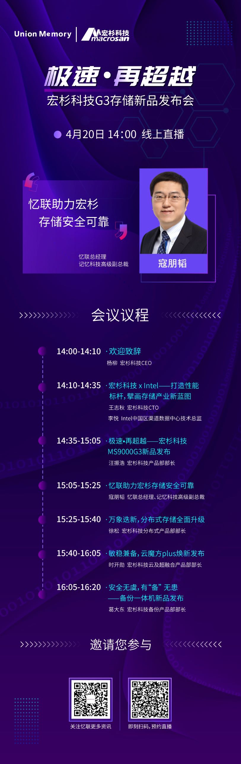 4月20日,“極速·再超越”宏杉科技G3存儲新品發布會將于線上舉辦,憶聯總經理、記憶科技高級副總裁寇朋韜受邀參會并發表主題演講,將對以上問題做出解答,為大家深度講述憶聯的產品力以及如何助力宏杉實現存儲安全可靠。