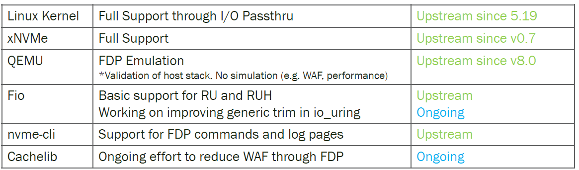 FDP的提案TP4146已經在2022年底通過NVMe正式批準。FDP也在逐步合入Linux Kernel、xNVMe等各大開源平臺中(如下圖),接下來就看應用軟件對接的發展了。