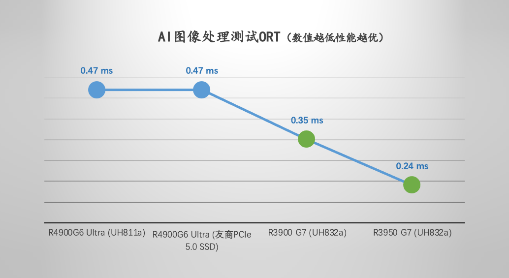 在本次測試中,搭載了UH832a的兩款H3C服務器,處理AI作業的總體響應時間(ORT)分別為0.35毫秒與0.24毫秒,突破了搭載上一代PCIe 4.0 ESSD以及國內友商Gen5 SSD的H3C UniServer R4900G6 Ultra服務器的數據(同為0.47毫秒),指標分別提升34.29%和48.94%。