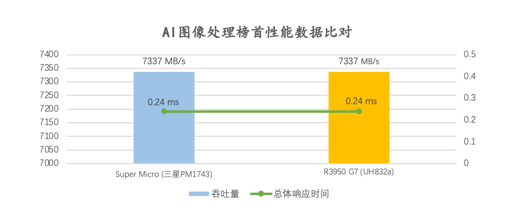 其中,H3C UniServer R3950 G7配置6.4TB UH832a,其對AI作業的總體響應時間與榜單上Super Micro Computer AS-1115CS-TNR服務器性能并列第一。該款服務器與H3C UniServer R3950 G7采用同款AMD EPYC 5th 9355P 處理器,搭載三星 PM1743 3.84TB SSD。測試中,二款產品均實現了對75個AI作業的處理,吞吐量均達到7337 MB/s,總體響應時間均為0.24毫秒。