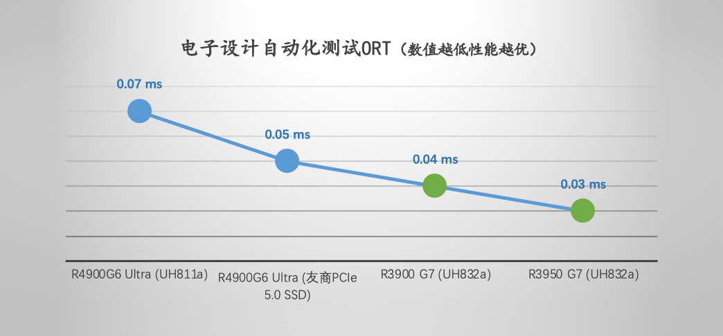 在本次測試中,搭載了UH832a的兩款H3C服務器,處理EDA混合工作負載的總體響應時間分別為0.04毫秒與0.03毫秒,雙雙突破了搭載上一代PCIe 4.0 ESSD以及國內友商Gen5 SSD的H3C UniServer R4900G6 Ultra服務器的數據(0.07毫秒和0.05毫秒)。即,憶聯UH832a對比上一代數據,總體響應時間指標最大提升57.14%,該成績同樣追平Super Micro Computer AS-1115CS-TNR服務器性能。