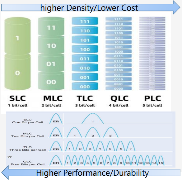 隨著存儲密度不斷增加,3D TLC (3bits/cell)成為主流存儲介質,3D QLC (4bits/cell)蓄勢待發。但是隨著密度的增加,可靠性會隨之降低,所以在應用的時候需要格外小心。現在PLC(5bits/cell)處于實驗室技術預研階段,將持續提高存儲密度。