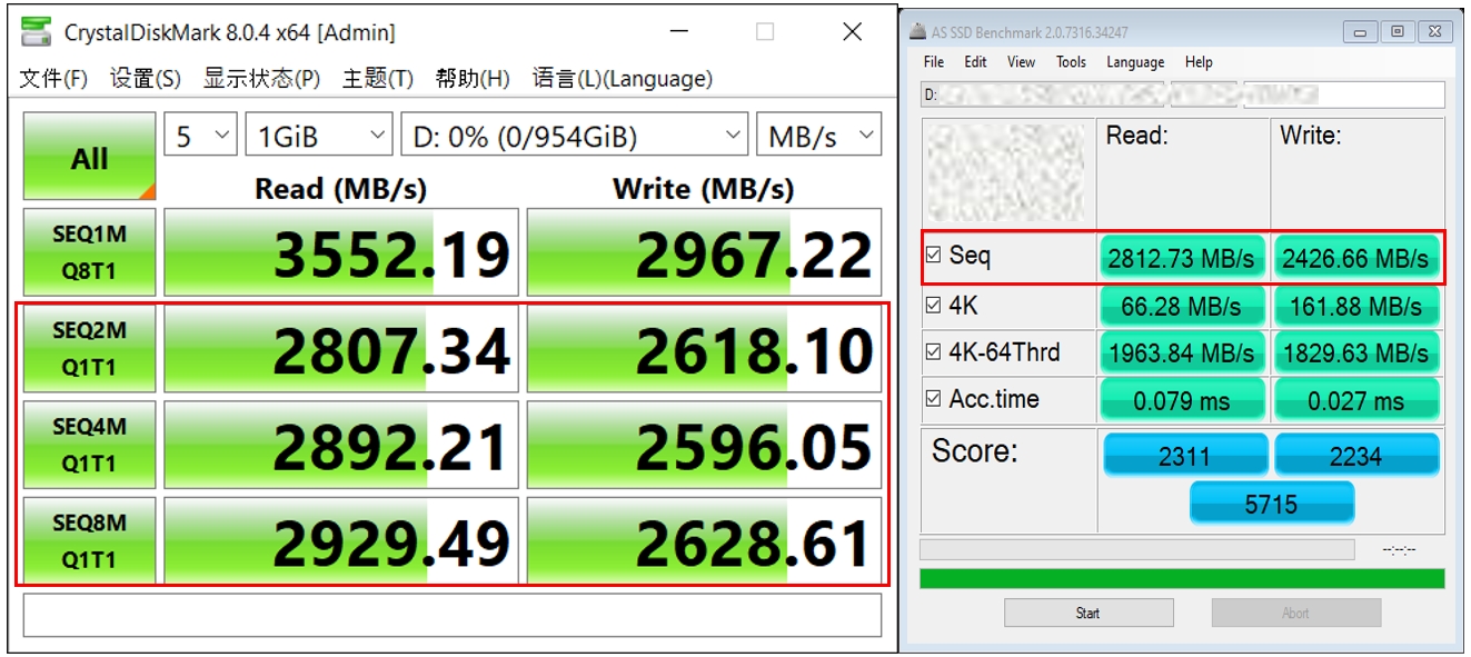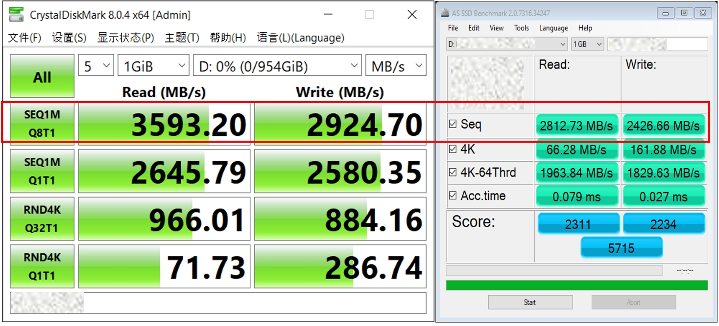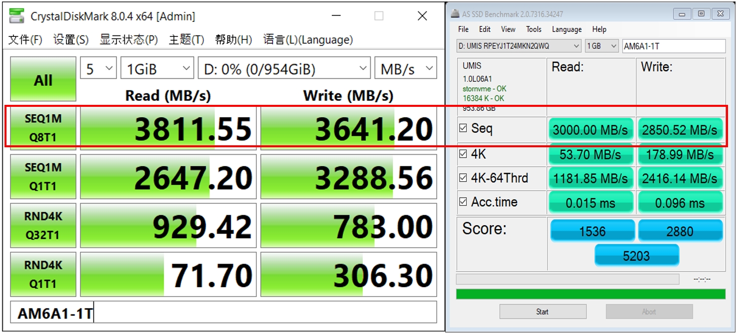 由于每一款測試軟件的側(cè)重點不同,測試出的數(shù)據(jù)也有所差異。以AS SSD和 CDM 為例,并選取憶聯(lián) AM6A1 和另一款原廠友商的 NVMe Gen4 1TB 產(chǎn)品作為測試對象,AS SSD 的順序讀寫性能和 CDM 測出的順序讀寫性能均相差了 1000MB/s 左右。