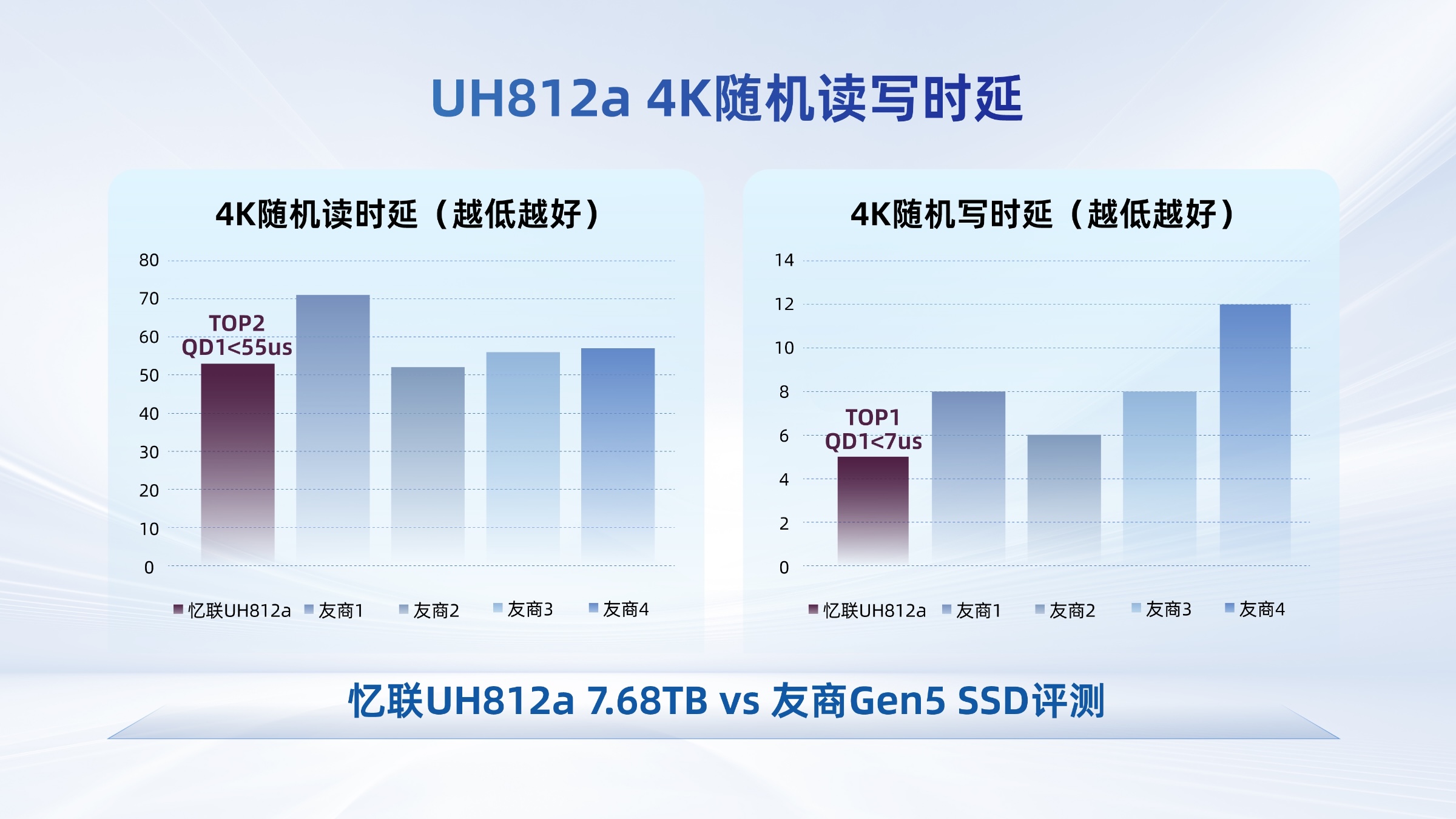 在高性能計算環境中,憶聯UH812a/UH832a的超低時延特性突出。4K隨機讀QD1時延<55μs,相比上一代(PCIe 4.0 SSD UH811a系列)改善43%,4K隨機寫性能位列友商TOP1,隨機讀對比國際友商優25%。無論是運行復雜的模擬程序還是處理海量數據集,都能達到微秒級響應,為高性能計算與數據密集型應用筑牢根基。
