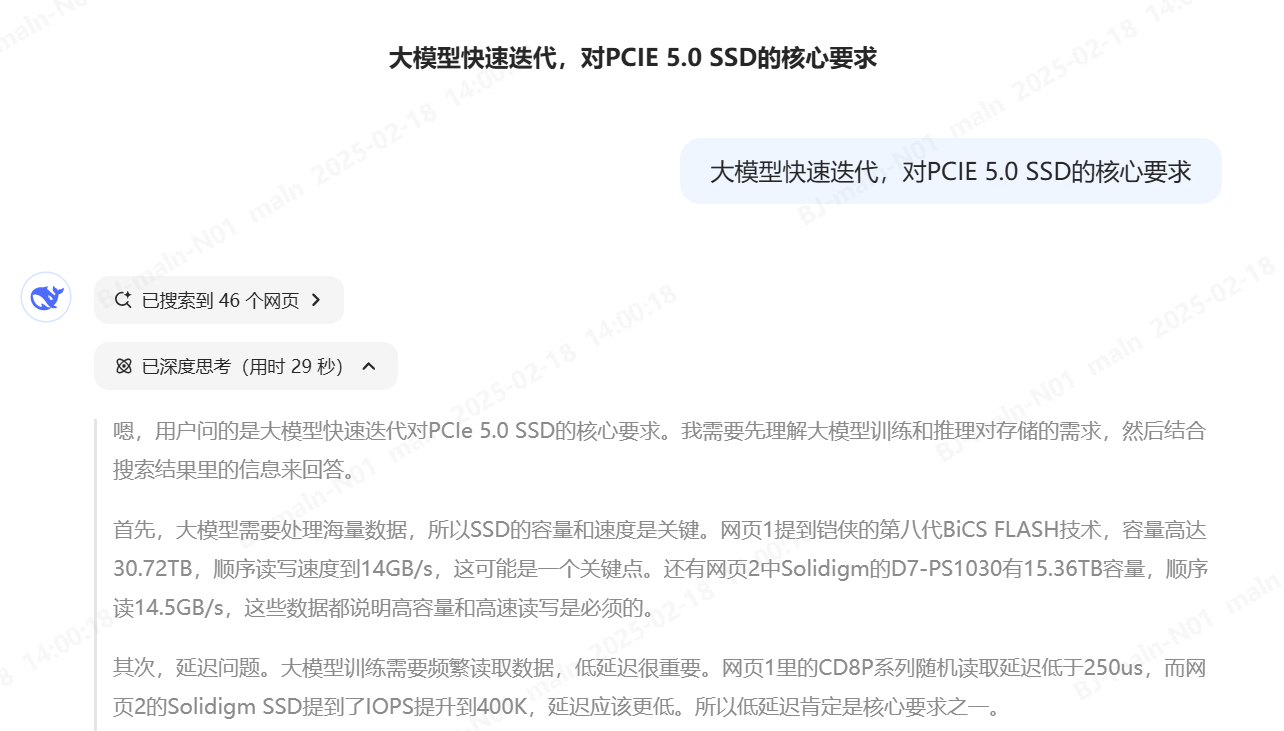 我們借助DeepSeek深度思考和聯網搜索能力將“大模型快速迭代,對PCIe 5.0 SSD的核心需求是什么”輸入給DeepSeek后,它給出如下回復:“大模型的快速迭代對存儲系統提出了更高要求,尤其是PCIe 5.0 SSD作為關鍵數據載體,需在讀寫性能、延遲、容量、可靠性等多維度全面突破,才能支撐大模型訓練/推理的實時性需求?!?span>