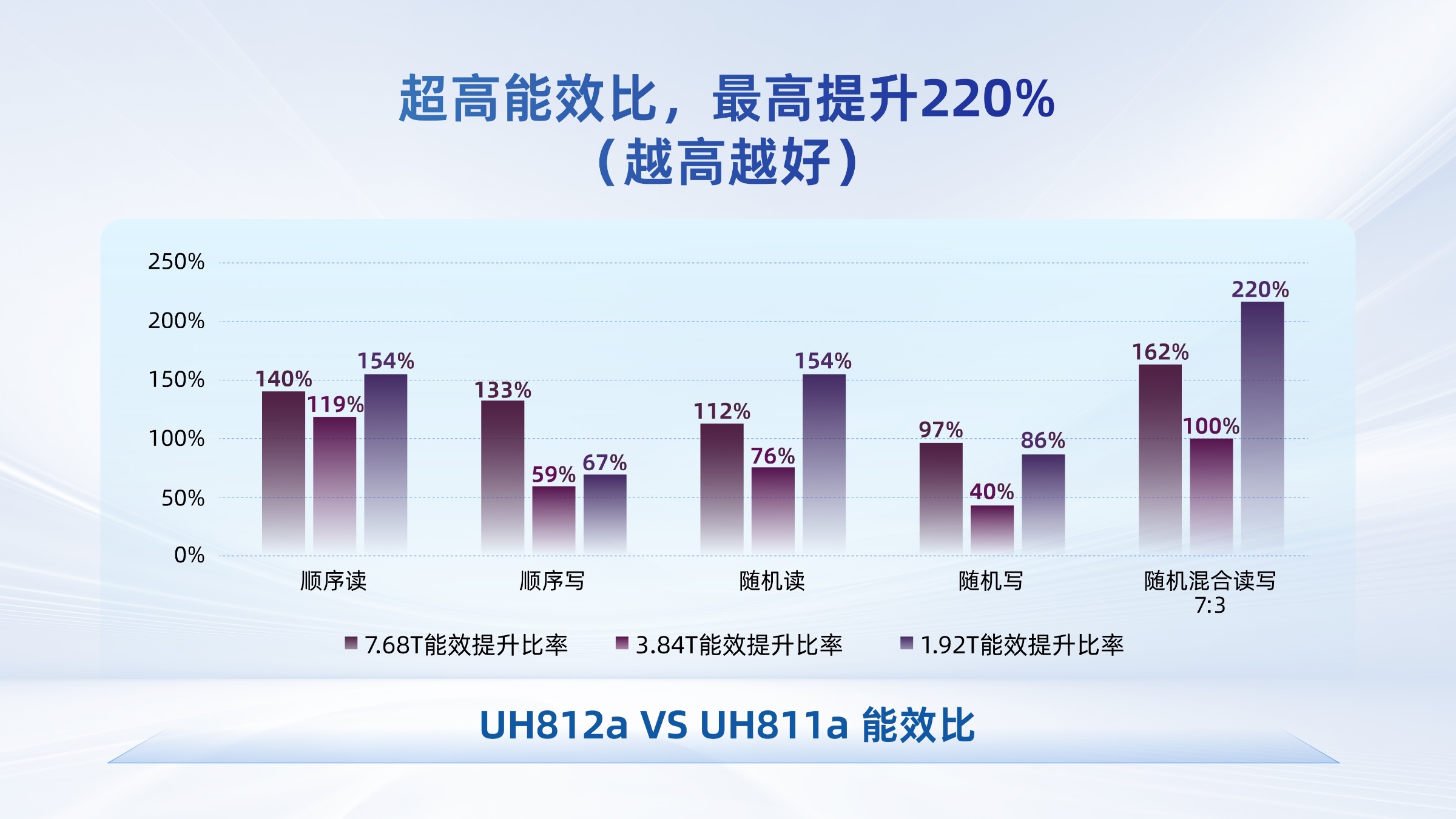 順序寫場景下,SR-IOV優化各VF的性能隔離調度邏輯,使各VF間的性能隔離度更好,對比上一代Gen4產品(UH811a/UH831a),UH812a/UH832a性能波動性由原來的5%降低到1%,能效比提高32%(實測性能/平均功耗),通過高效精確的VF Qos 調優技術,平均時延降低20%。