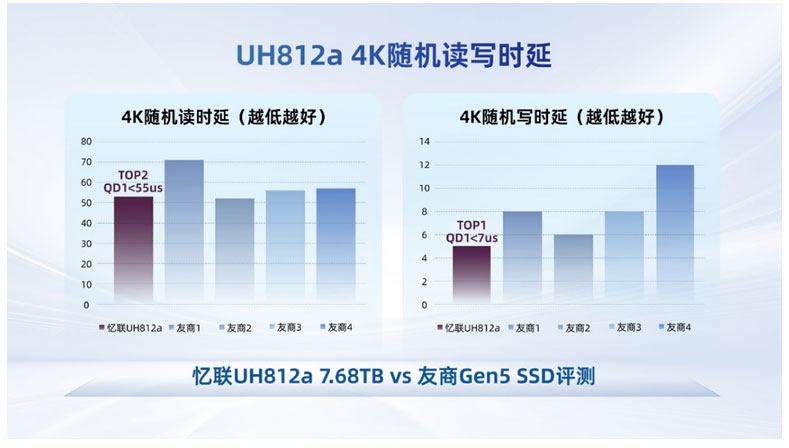 測試結果表明, UH812a 產品性能卓越,全面達成且超出設計目標。其在關鍵性能指標上顯著領先于同代際主流競品,充分釋放了PCIe Gen5高速總線和平臺內存帶寬的性能潛力。
