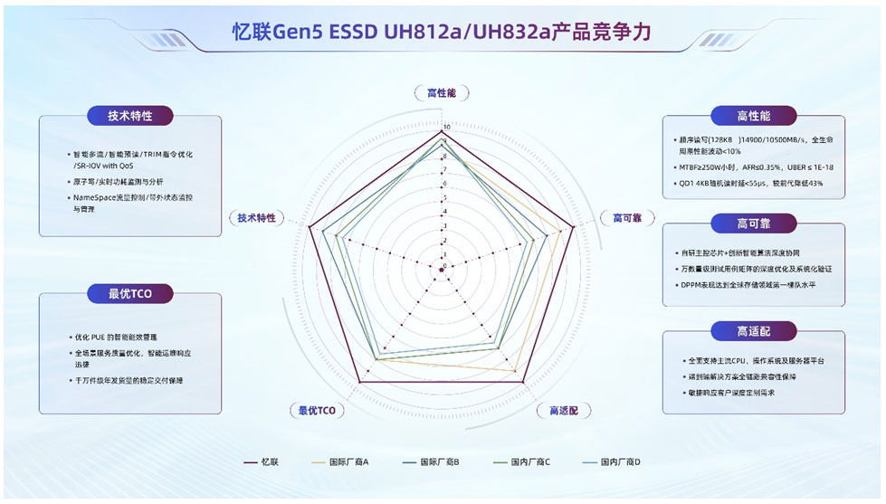 近日,憶聯新一代 PCIe 5.0 企業級 SSD UH812a 成功通過英特爾數據中心與人工智能事業部(DCAI)中國區關鍵組件驗證計劃的性能基準測試,成為首家通過該驗證的國產存儲廠商。測試結果顯示,UH812a 在關鍵性能指標上顯著領先于同代際主流競品,其卓越的性能與穩定性充分釋放了 PCIe Gen5 高速總線及平臺內存帶寬潛力,同時有力印證了憶聯與英特爾在數據中心存儲領域的深度合作成果。