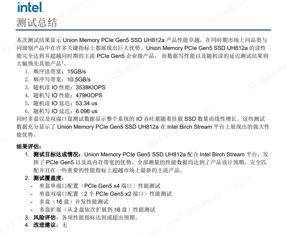 作為Intel DCAI China關鍵組件驗證計劃的重要組成部分,Benchmark 旨在通過標準化、可重復的測試方法與指標體系,量化評估計算機硬件或軟件在特定工作負載下的性能表現,通過覆蓋典型用戶場景的全棧驗證,范圍貫穿從物理層信號完整性到應用層算法的完整技術鏈,充分彰顯憶聯行業領先的技術實力。