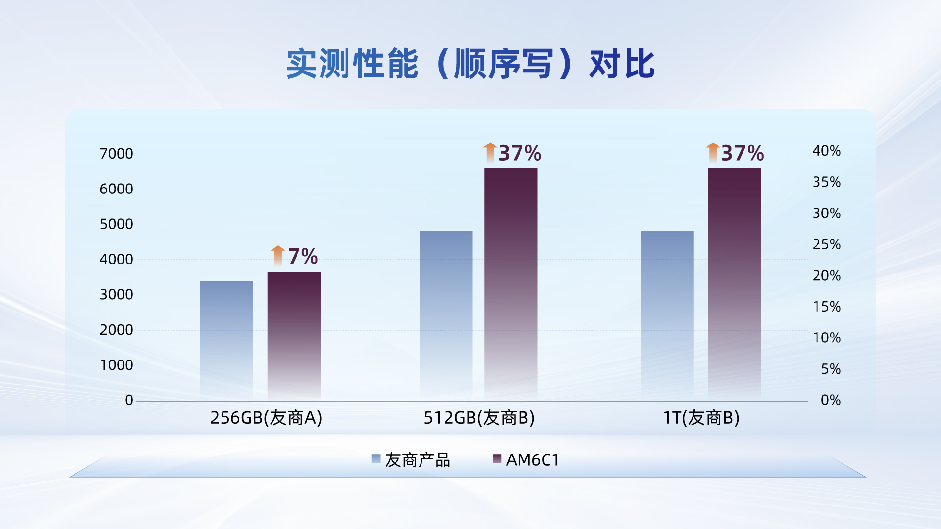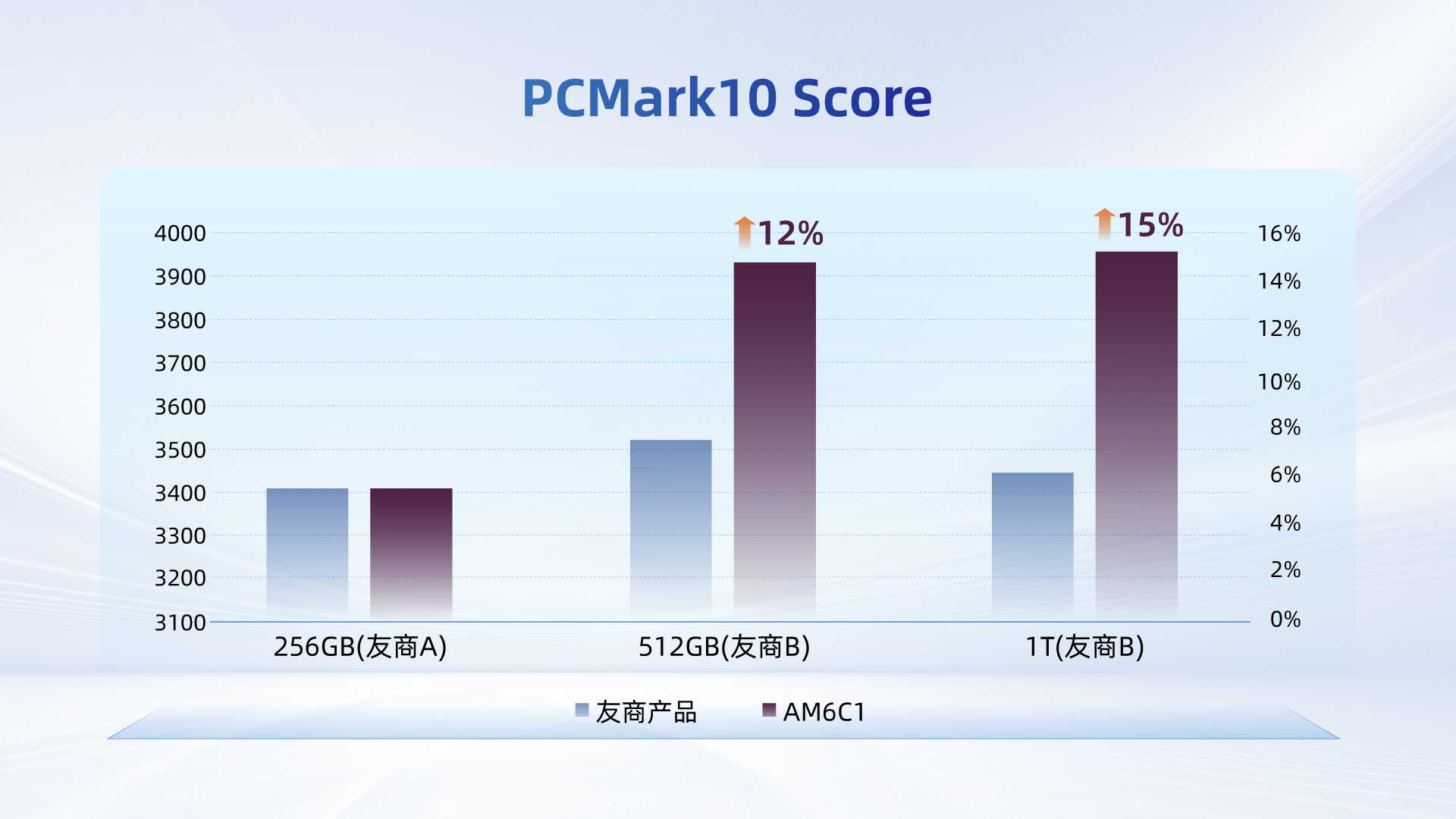在PCMark 10測試中,AM6C1的512GB與1TB版本得分均突破3900,較友商B同類產(chǎn)品領(lǐng)先10%以上;其256GB版本的表現(xiàn)亦與友商A的同級產(chǎn)品相當(dāng)。