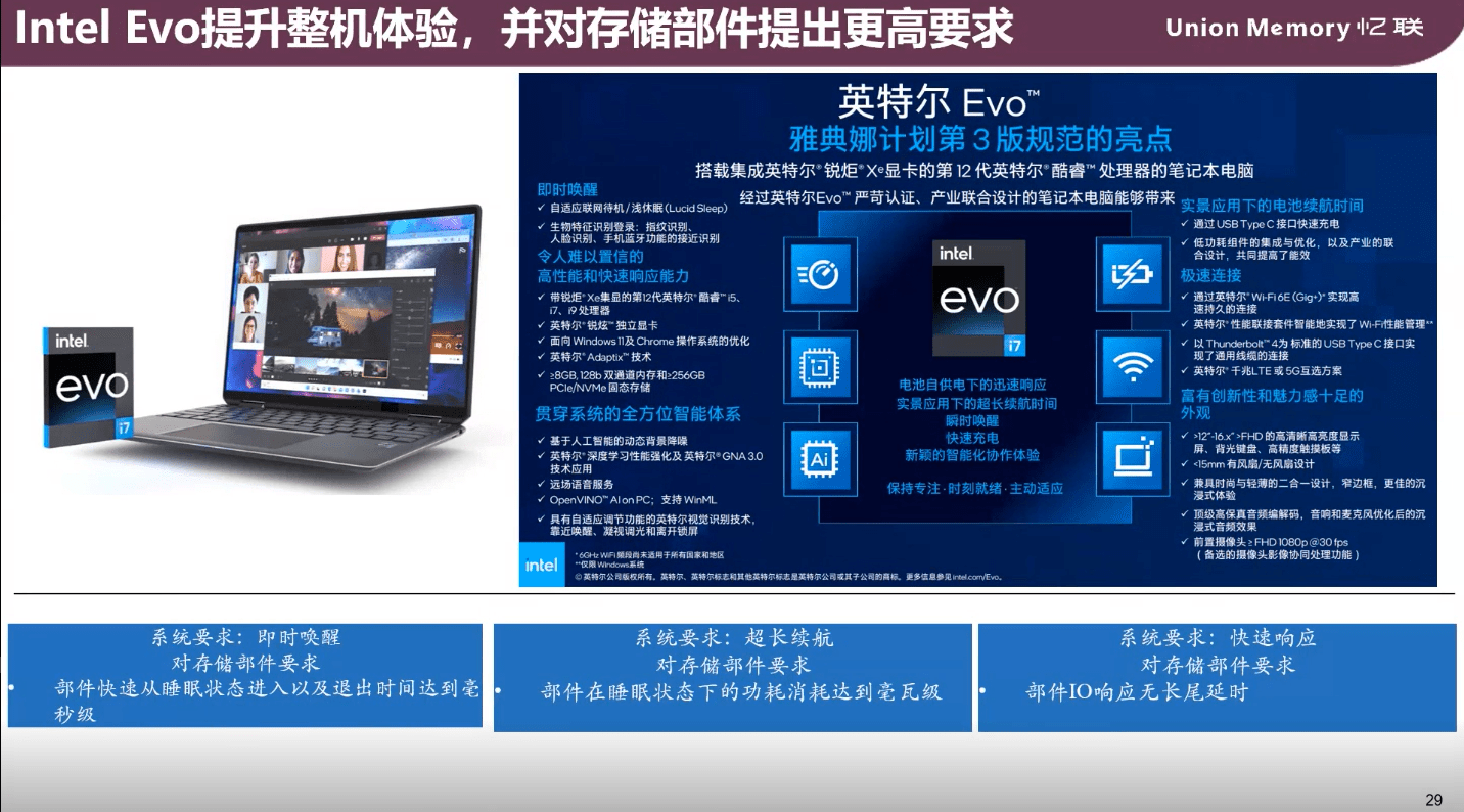 楊錦平表示,隨著英特爾Evo提升了整機體驗,對存儲部件設(shè)計也提出了更高要求:一是即時喚醒,需要存儲快速從睡眠狀態(tài)進入工作狀態(tài);二是超長續(xù)航,則需要存儲部件在睡眠狀態(tài)下維持毫瓦級功耗;三是快速響應(yīng),存儲不能出現(xiàn)高延遲的情況。
