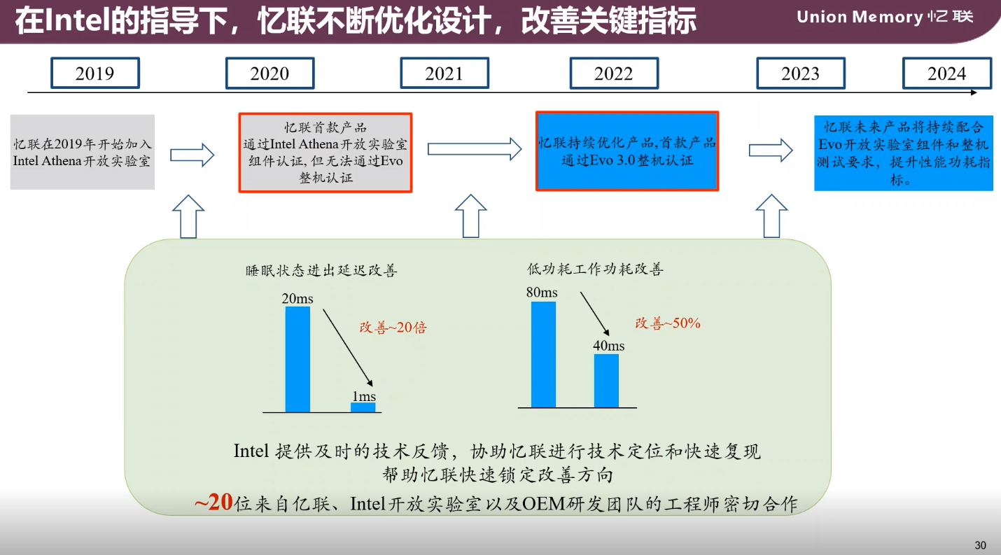 為了達(dá)到以上要求,憶聯(lián)在2019年便加入英特爾雅典娜開放實驗室,過去幾年里與英特爾保持密切合作。在來自憶聯(lián)、英特爾開放實驗室、OEM研發(fā)團隊約20位工程師的共同努力下,憶聯(lián)持續(xù)優(yōu)化迭代產(chǎn)品,將睡眠狀態(tài)下進出延遲由20ms降低至1ms,響應(yīng)速度提升了20倍,低功耗則優(yōu)化了50%,并最終通過了Evo認(rèn)證。整個過程中英特爾提供了非常及時的技術(shù)反饋,協(xié)助憶聯(lián)從技術(shù)定位、快速復(fù)現(xiàn),包含在實驗室中提供可以區(qū)別憶聯(lián)深度解讀的數(shù)據(jù)來鎖定這些改善的方向。目前憶聯(lián)是國內(nèi)在PC SSD領(lǐng)域中首家通過英特爾Evo整機認(rèn)證的存儲廠商。