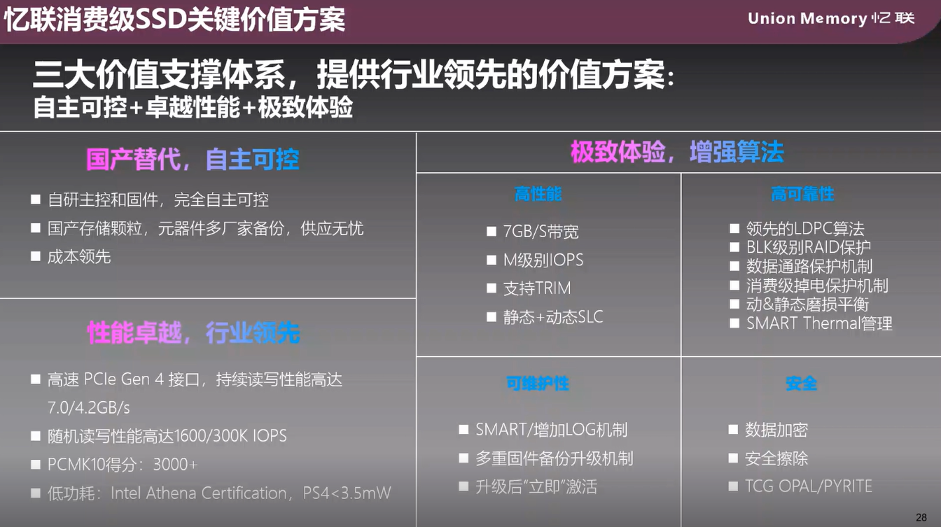 自成立以來,憶聯(lián)緊密圍繞客戶與市場需求,持續(xù)提升技術(shù)創(chuàng)新能力,一直以卓越的產(chǎn)品性能引領(lǐng)行業(yè)標(biāo)準(zhǔn)。比如在PCIe Gen 4的產(chǎn)品上憶聯(lián)有著讀寫性能高達(dá)4.2G和7G的高端產(chǎn)品,同時憶聯(lián)在算法上也積累了許多經(jīng)驗,在如何提升性能、可靠性、維護性和安全方面都有著自研的算法,為憶聯(lián)始終在行業(yè)內(nèi)保持領(lǐng)先地位提供了有利保障。