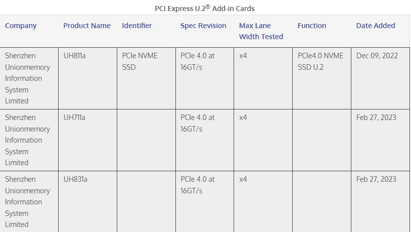 憶聯(lián)首款數(shù)據(jù)中心級(jí)SSD UH711a和企業(yè)級(jí)SSD UH811a/UH831a通過(guò)PCI-SIG Gen4 16Gbps兼容性認(rèn)證,且在PCI-SIG認(rèn)證產(chǎn)品列表中均已被正式收錄。