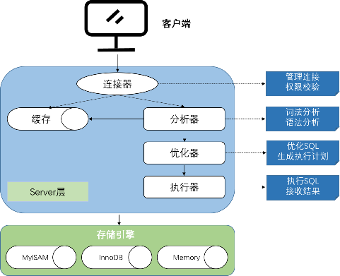MySQL 是當(dāng)前最流行的關(guān)系型數(shù)據(jù)庫管理系統(tǒng)之一,因其代碼開源,且具備體積小、速度快、總擁有成本低等優(yōu)勢,在大、中、小型企業(yè)中皆有應(yīng)用。MySQL在架構(gòu)上主要分為Server層和存儲引擎層。其中Server層又分為連接器、緩存、分析器、優(yōu)化器、執(zhí)行器,所有跨存儲引擎的功能都在這層實現(xiàn);存儲引擎是可插拔式的,常見的存儲引擎有MyISAM、InnoDB、Memory等。